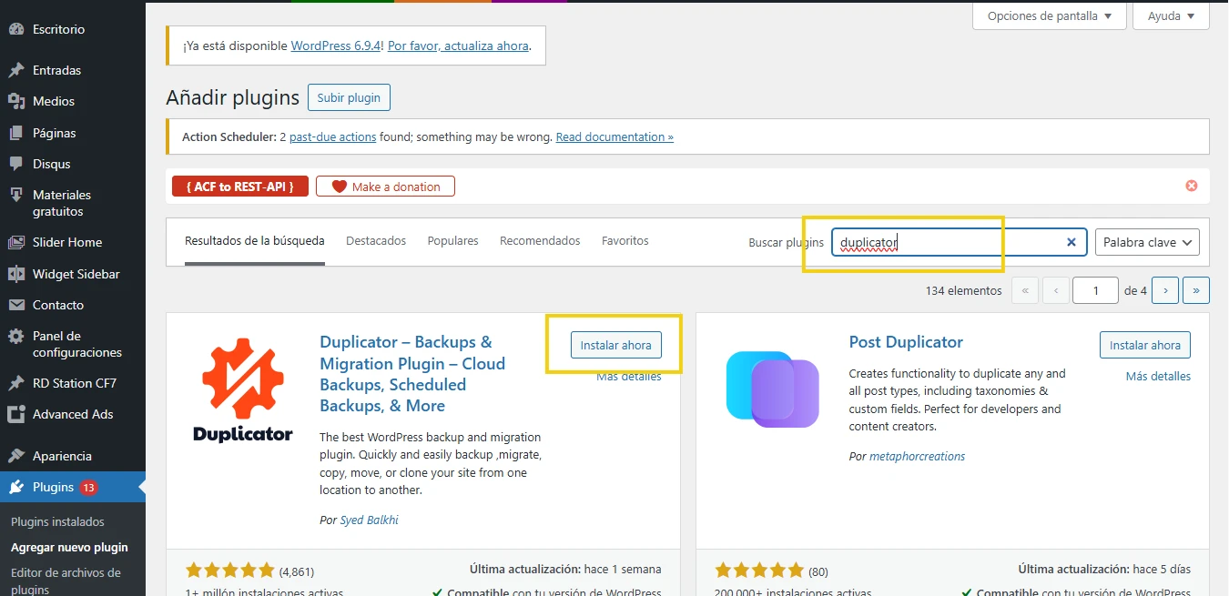 2 – Busca por Duplicator en el campo de búsquedas. Al encontrar el plugin, haz clic en Instalar ahora.